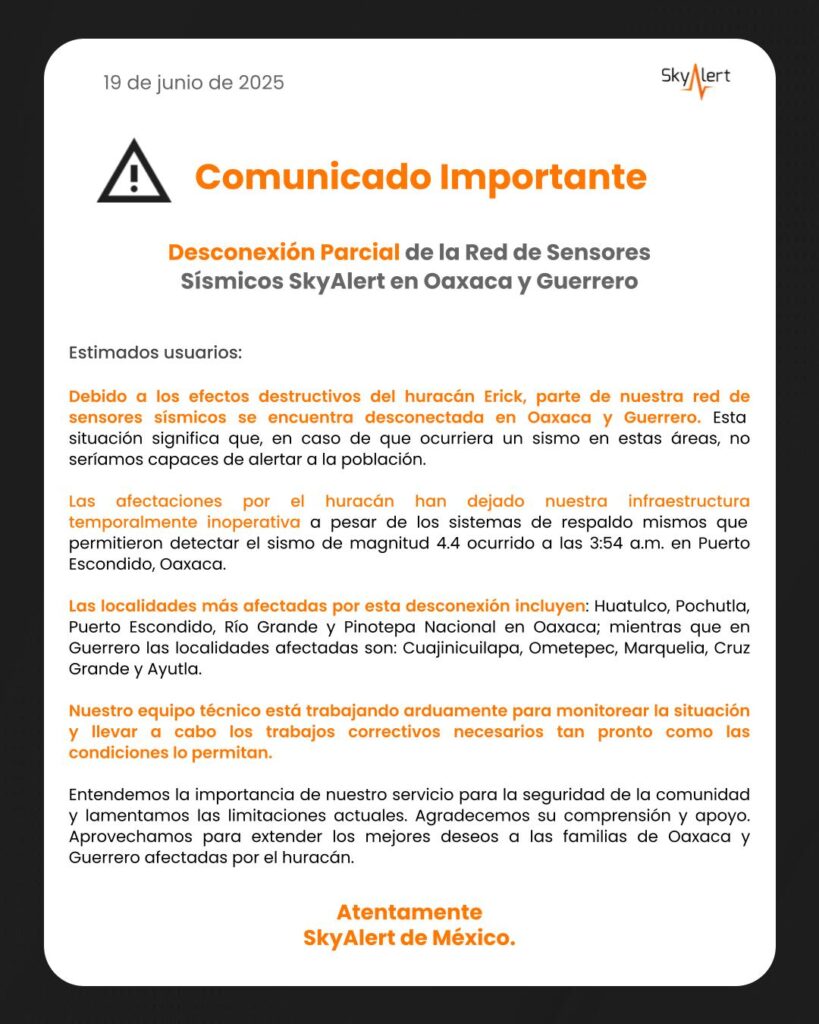 Tras el paso del huracán Erick y sus efectos en los estados de Guerrero y Oaxaca, el sistema SkyAlert México informó, a través de un comunicado, que su red de sensores sísmicos debió ser desconectada.