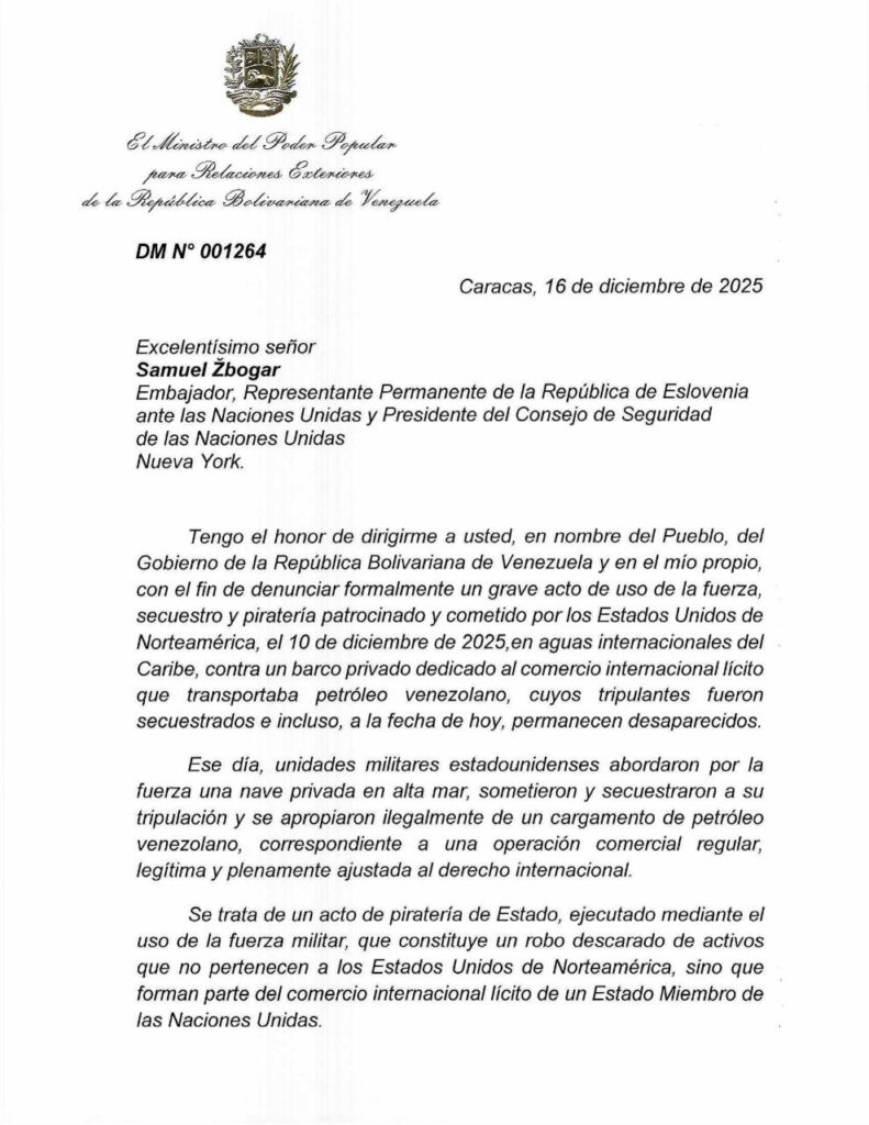 Tras la difusión del material y la incautación del buque, Venezuela llevó el caso al Consejo de Seguridad de la ONU. En su denuncia acusa a Estados Unidos de: