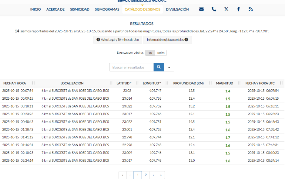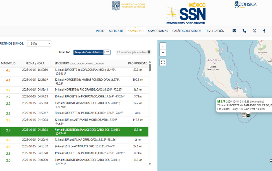 Los sismos se han comenzado a convertir en el día a día para Los Cabos, en particular para San José del Cabo, y es que en lo que va de este miércoles 15 de octubre, se han registrado 14 microsismos. El más intenso hasta el momento fue de magnitud 2.3 el cual se registró a las 3:35 am (hora local).